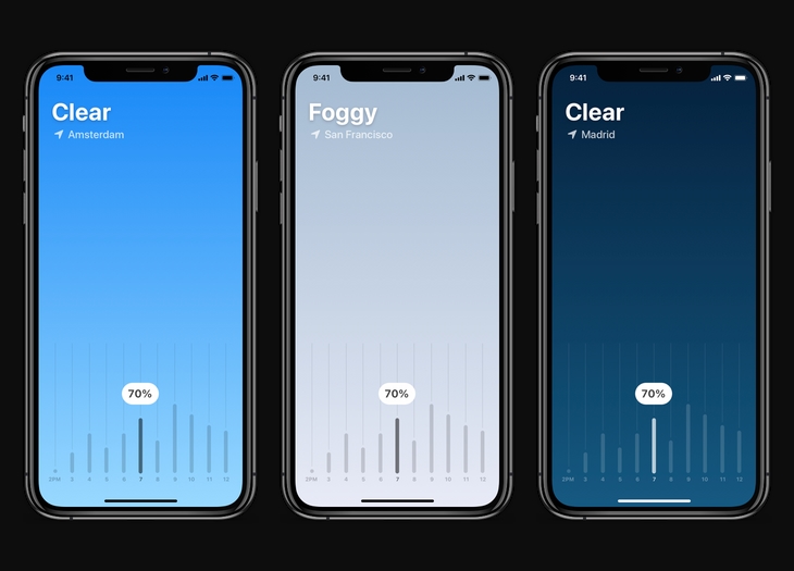 Data is provided by a geolocation service and Dark Sky, a service that provides forecast data. Their API provides very detailed predictions for precipitation numbers throughout the day. Being able to inject accurate and precise data allowed me to iterate quickly and experiment with different UI concepts.